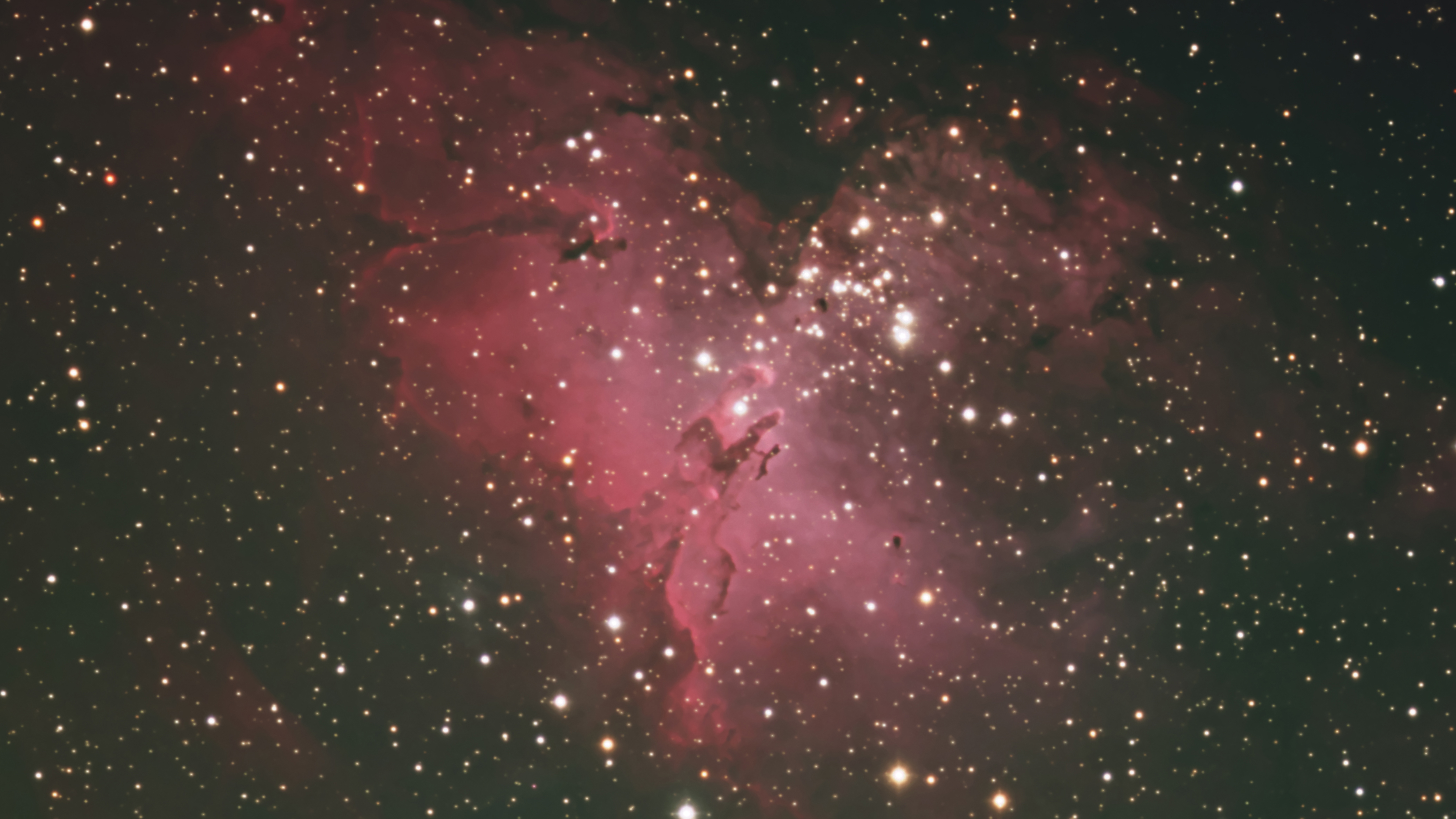 DESCRIPTION: The Eagle Nebula (also known as the pillars of creation), was discovered in 1745 by Jean-Phillippe de Cheseaux. This nebula is 5700 light years away in the Sagittarius Arm of the Milky Way. This region is known for very intense star formations within the nebula spires and dark bubbles of dust and gas seen in the image. The spire in the upper left is 9.5 light years, or 5.9 tillion miles long.
