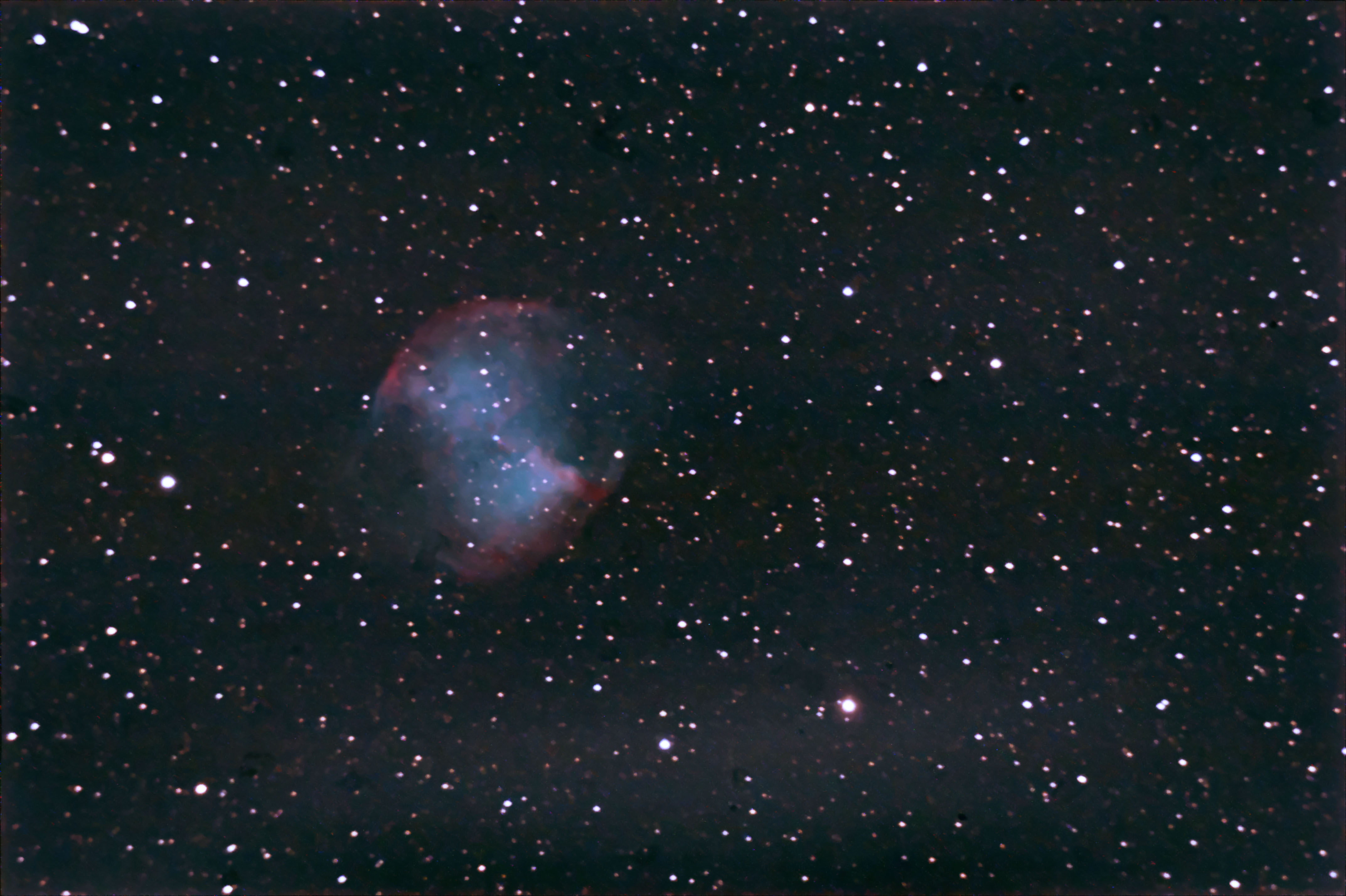DESCRIPTION: Discovered in 1764 the Dumbbell Nebula was the first planetary nebula ever found. M27 is roughly 1,360 light years from earth, it's diameter is about 8 arcminutes across which gives it a visual magnitude of 7.5, making this a easy target. The approximate age of this planetary nebula is between 9,800 and 14,600 years old, from the image the blue centeral star is visable.